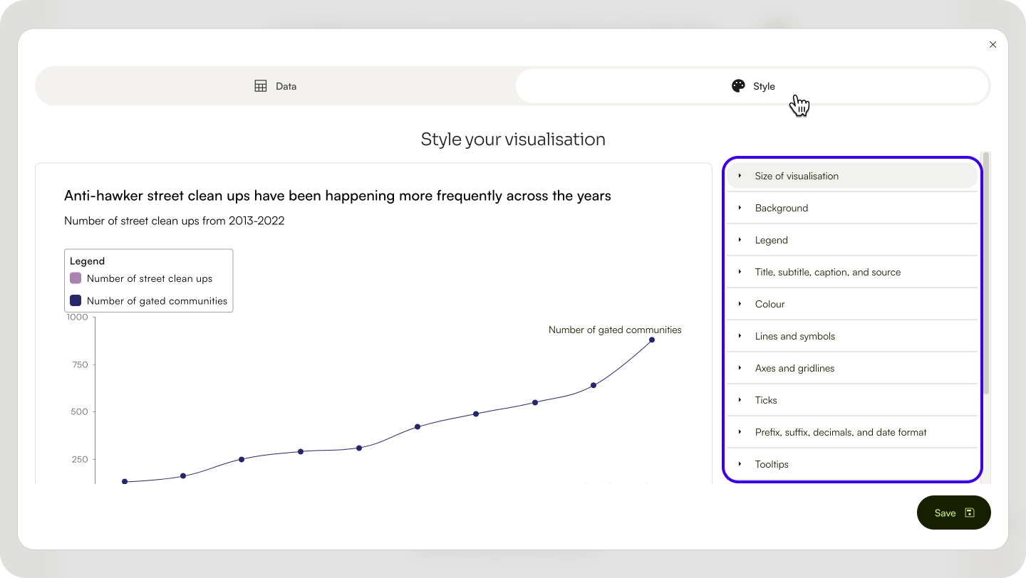 To style your data visualisation, open the 'Style your visualisation' menu.