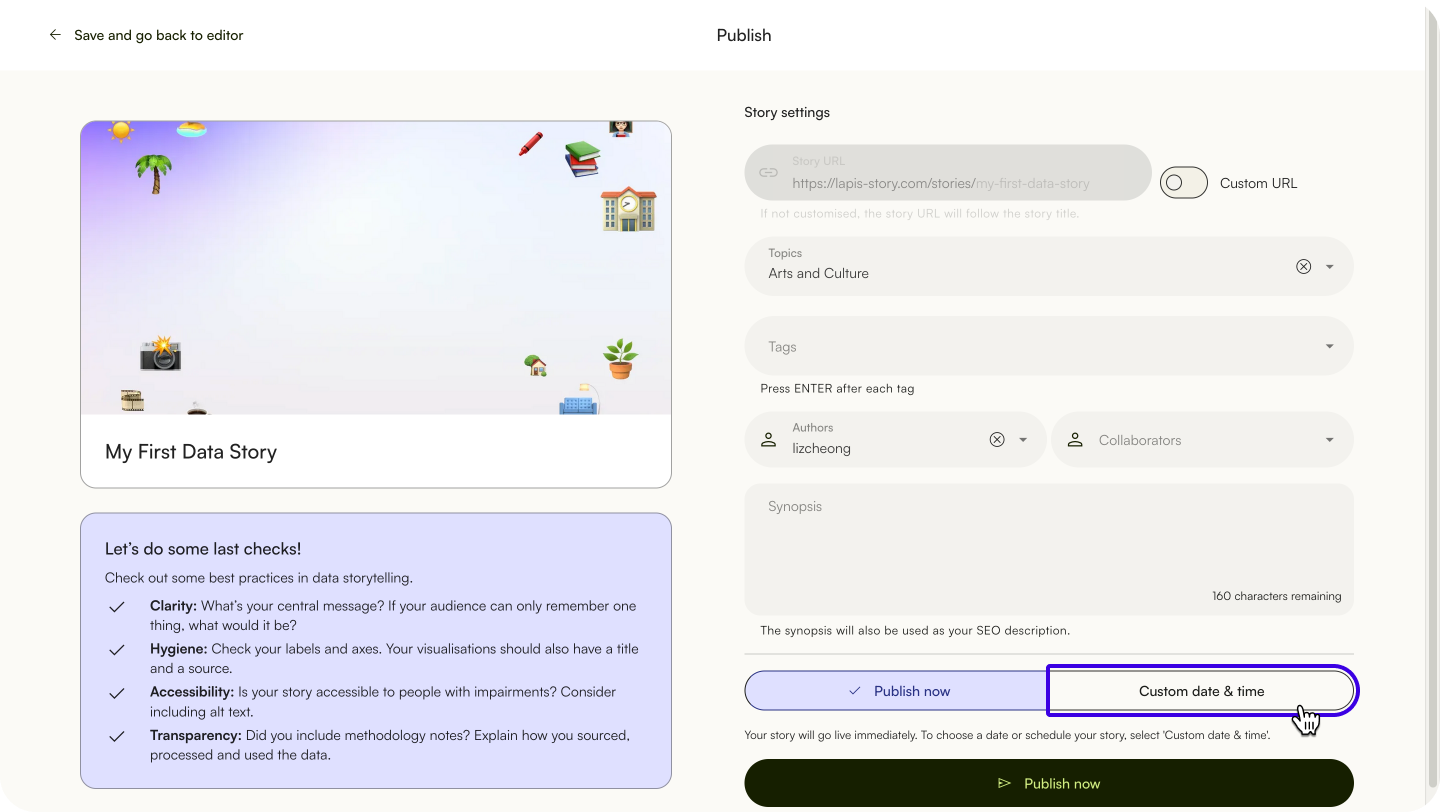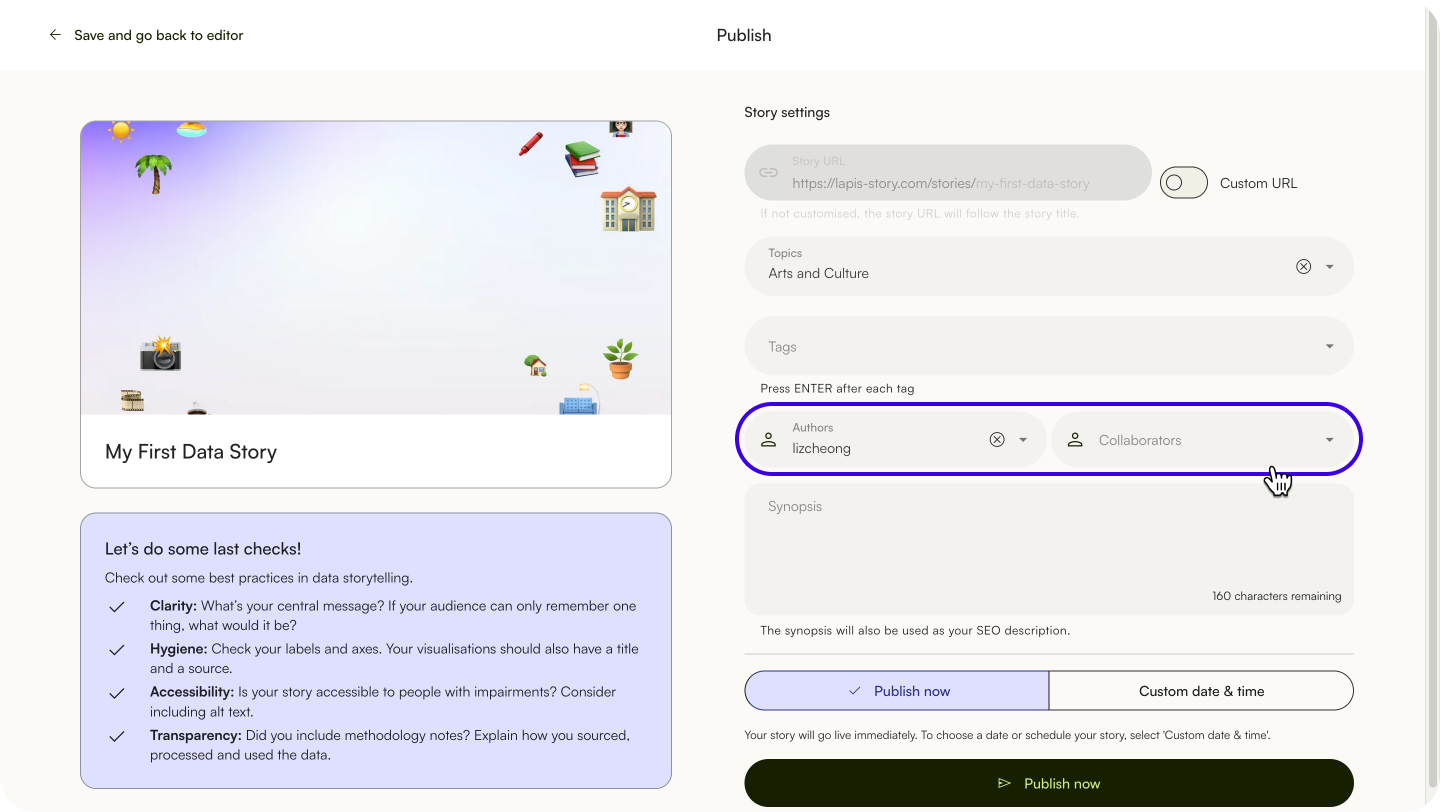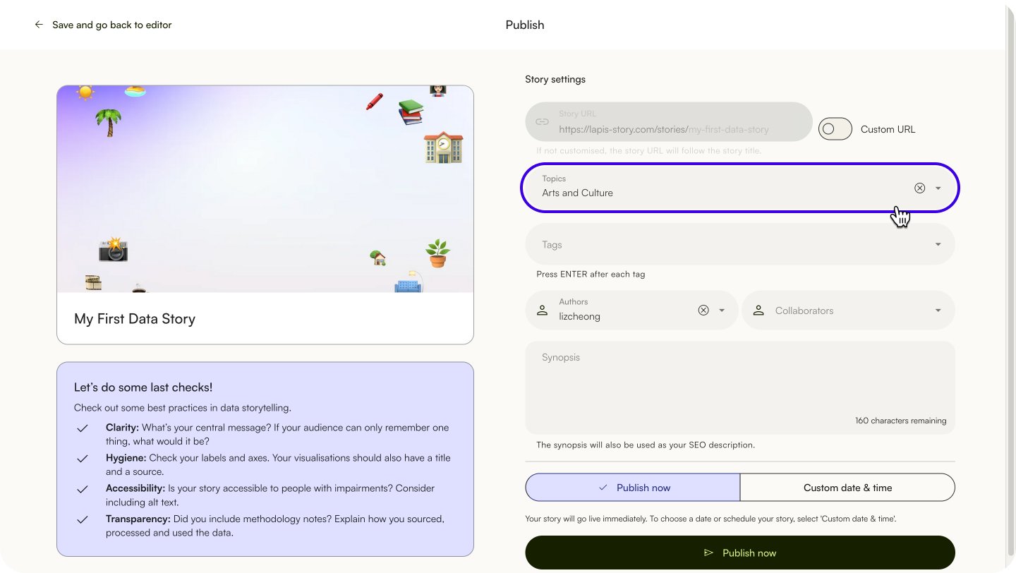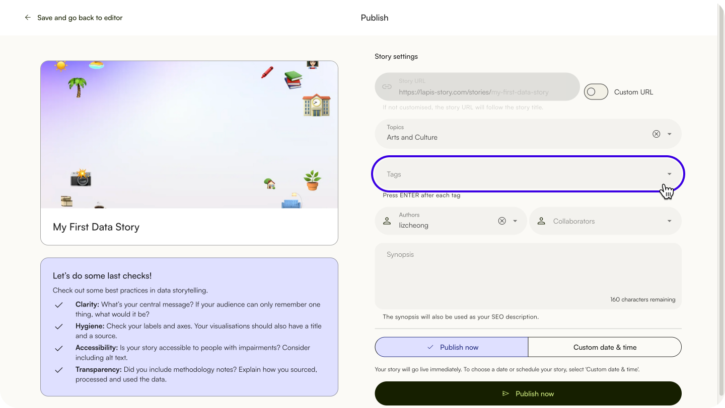 In Lapis, you can customise the URL for your data story, set the publication date and time, and select a topic and tags to improve SEO.