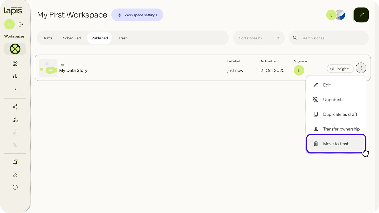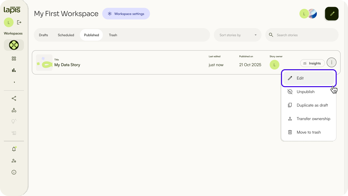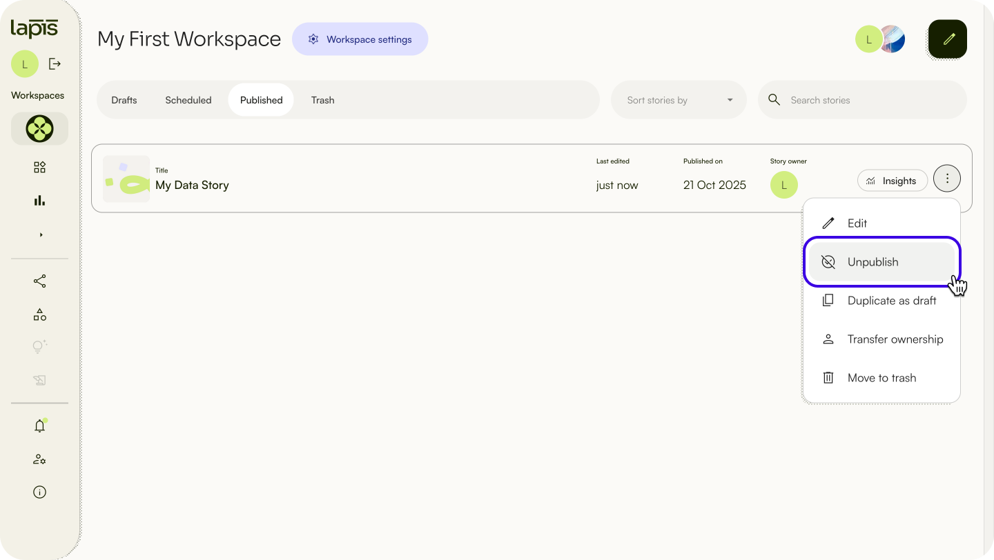 1. In your Workspace, click the ‘Published’ tab to view all published stories.