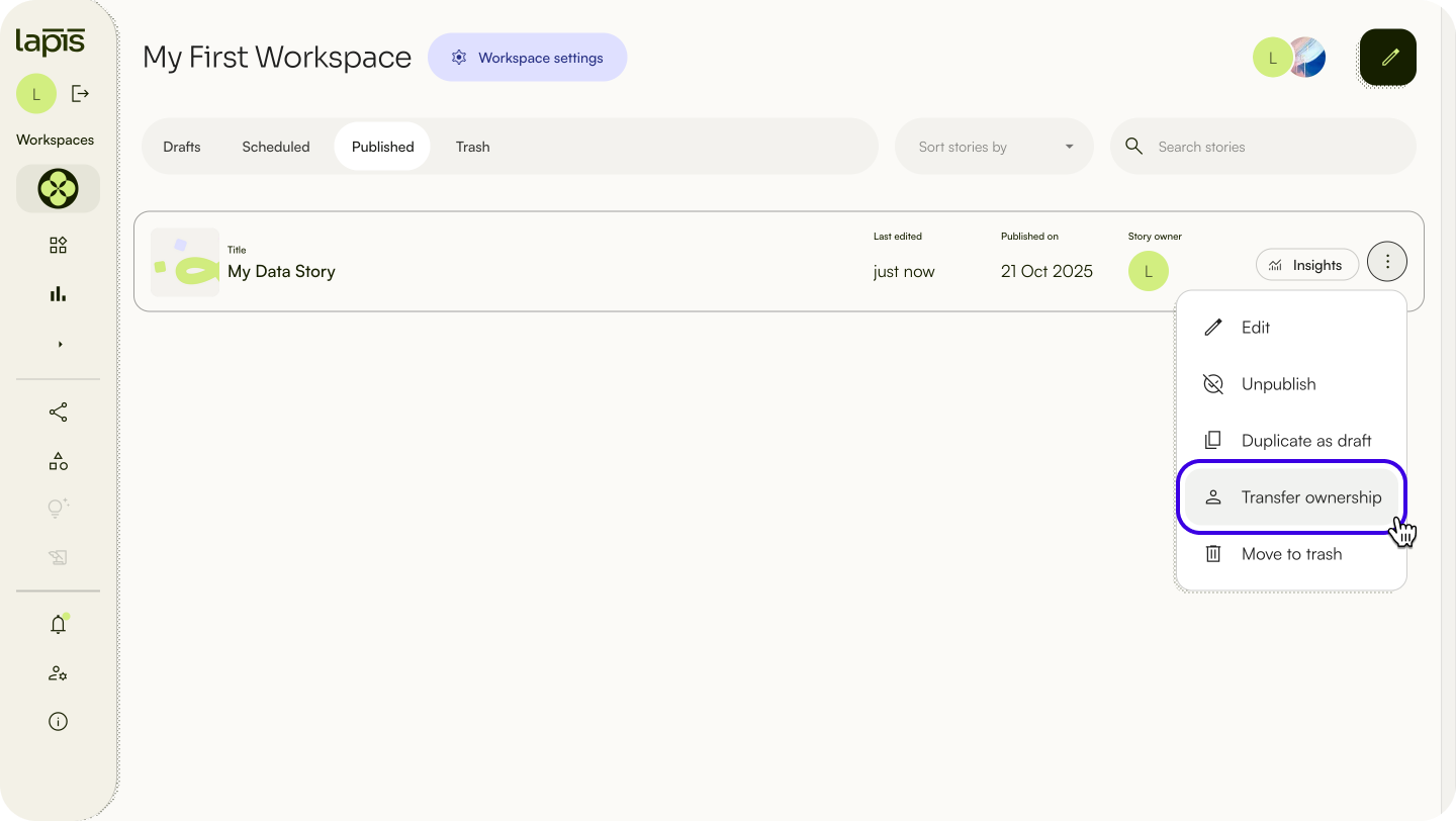 You can transfer the ownership of a published story to another user in the same Workspace.